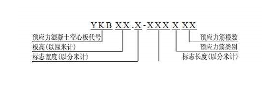 空心板的型號由名稱、高度、標誌長度、標誌寬度、預應力配筋組成,其表示方式如一般以下: